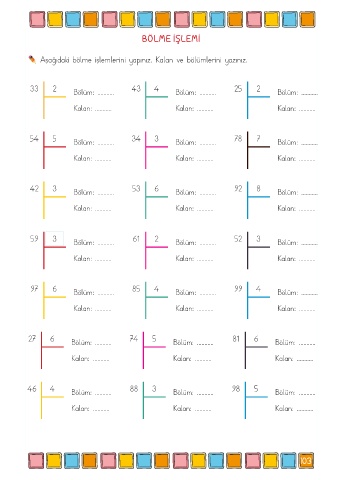 Aşağıdaki bölme işlemlerini yapınız. Kalan ve bölümlerini yazınız.