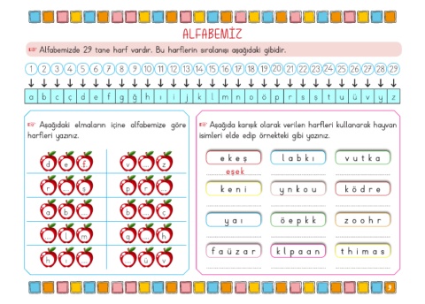 + Alfabemizde 29 tane harf vardır. Bu harflerin sıralanışı aşağıdaki gibidir.