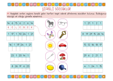 + Aşağıdaki verilen sayılara karşılık gelen harfleri tespit ederek şifrelenmiş sözcükleri bulunuz. Bulduğunuz