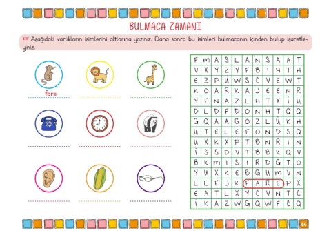 BULMACA ZAMANI + Aşağıdaki varlıkların isimlerini altlarına yazınız. Daha sonra bu isimleri bulmacanın içinden bulup işaretle- yiniz. fare 44