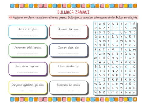+ Aşağıdaki soruların cevaplarını altlarına yazınız. Bulduğunuz cevapları bulmacanın içinden bulup işaretleyiniz.
