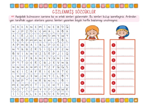 + Aşağıdaki bulmacanın içerisine kız ve erkek isimleri gizlenmiştir. Bu isimleri bulup işaretleyiniz. Ardından