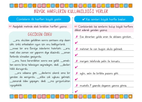 + Aşağıdaki metinde eksik bırakılan harfleri yazınız. + Cümlelerdeki kişi isimlerini bulup büyük harflere