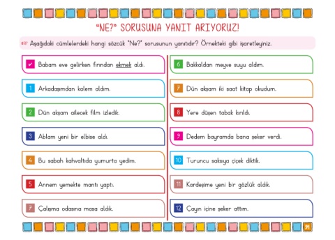 + Aşağıdaki cümlelerdeki hangi sözcük “Ne?” sorusunun yanıtıdır? Örnekteki gibi işaretleyiniz.