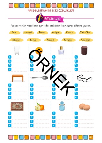 Aşağıda verilen maddelerin ayırt edici özelliklerini belirleyerek altlarına yazalım.
