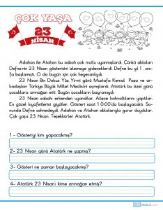 1. Sınıf Türkçe 23 Nisan Okuma Anlama Metni