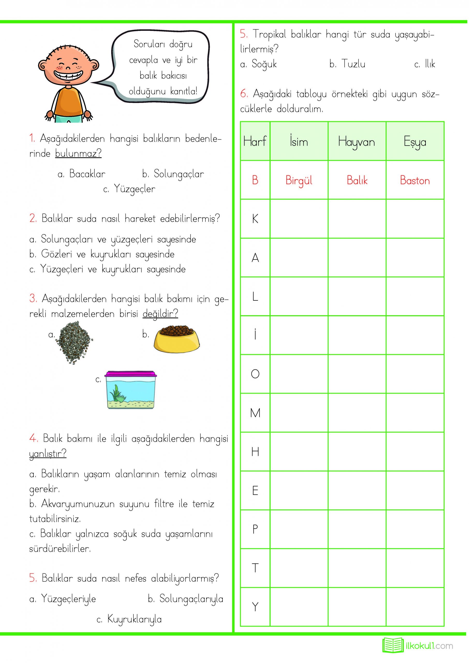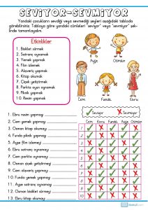 1. Sınıf Türkçe Tablo Okuma Çalışması