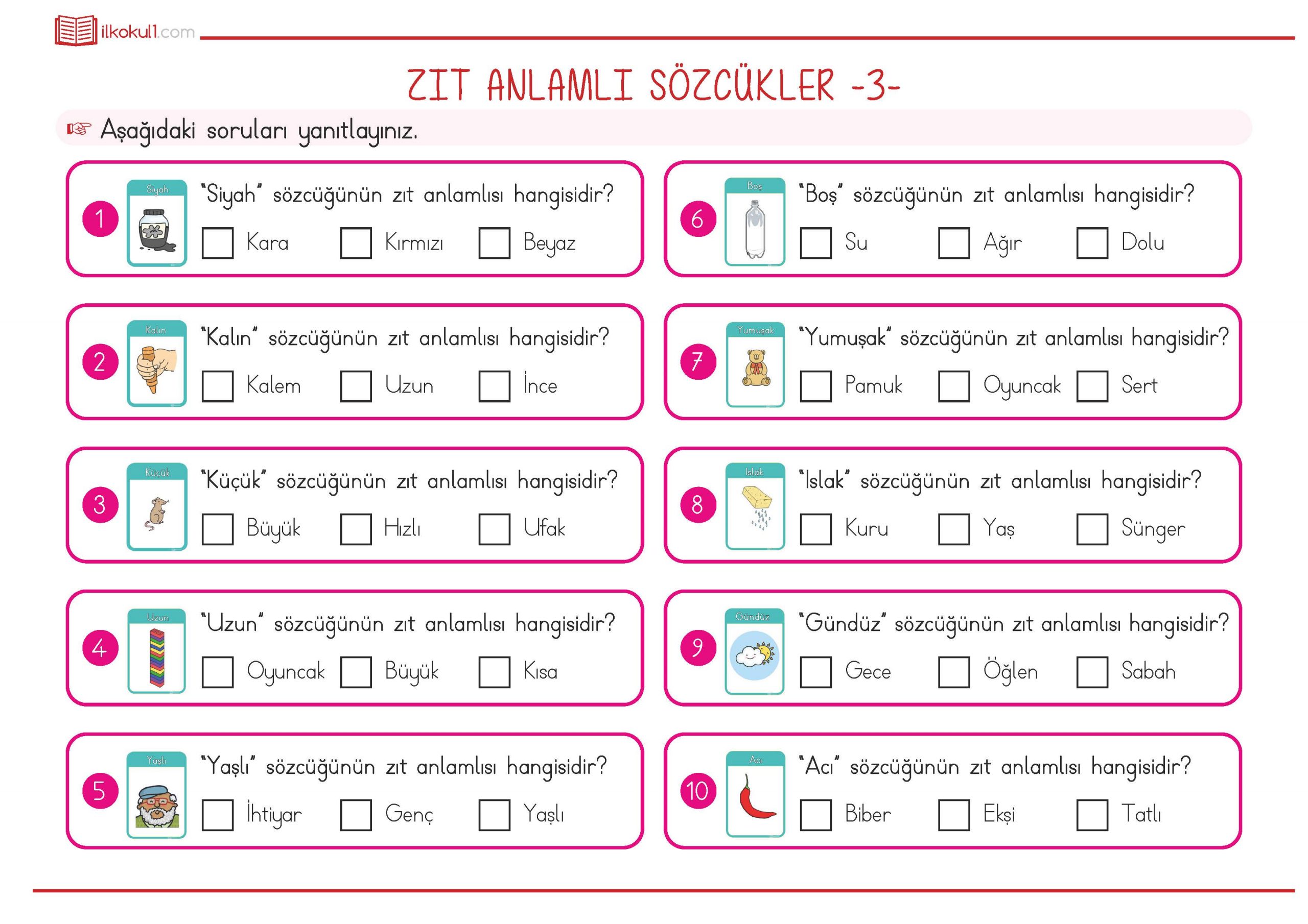 1. Sınıf Türkçe -Zıt Anlamlı Sözcükler 3-