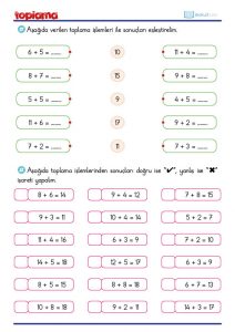 • Doğru-Yanlış Etkinlikleri: Toplama işlemlerinin sonuçlarını kontrol ederek doğru ve yanlış cevapları işaretlerler. Bu, dikkat ve problem çözme becerilerini geliştirir.