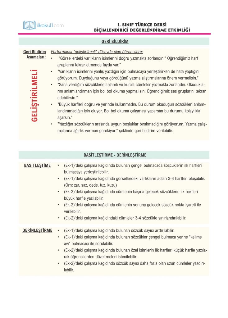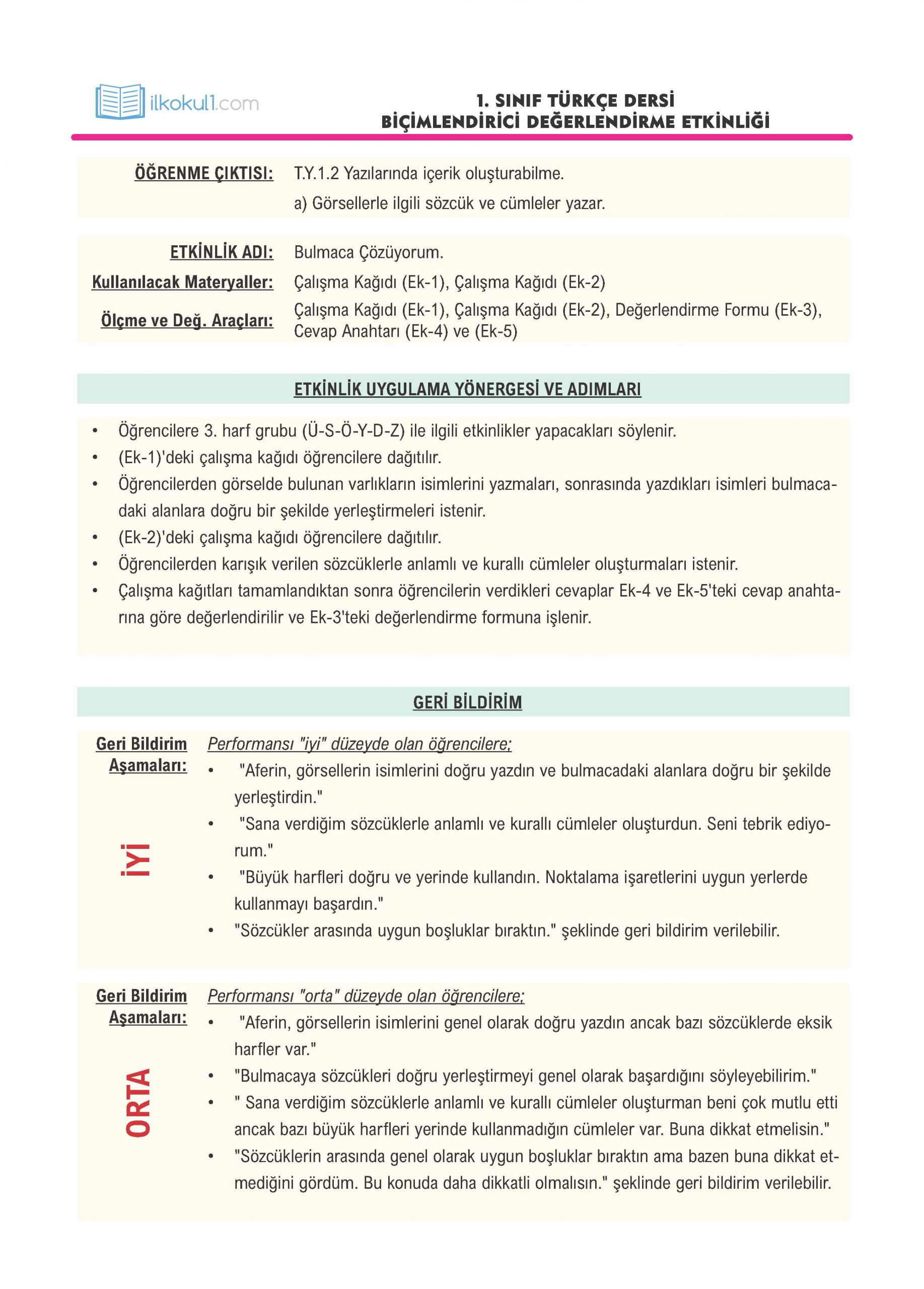 1. sınıf Türkçe Dersi Özgün “Biçimlendirici Değerlendirme” etkinlik sayfasını aşağıdan indirebilirsiniz:
