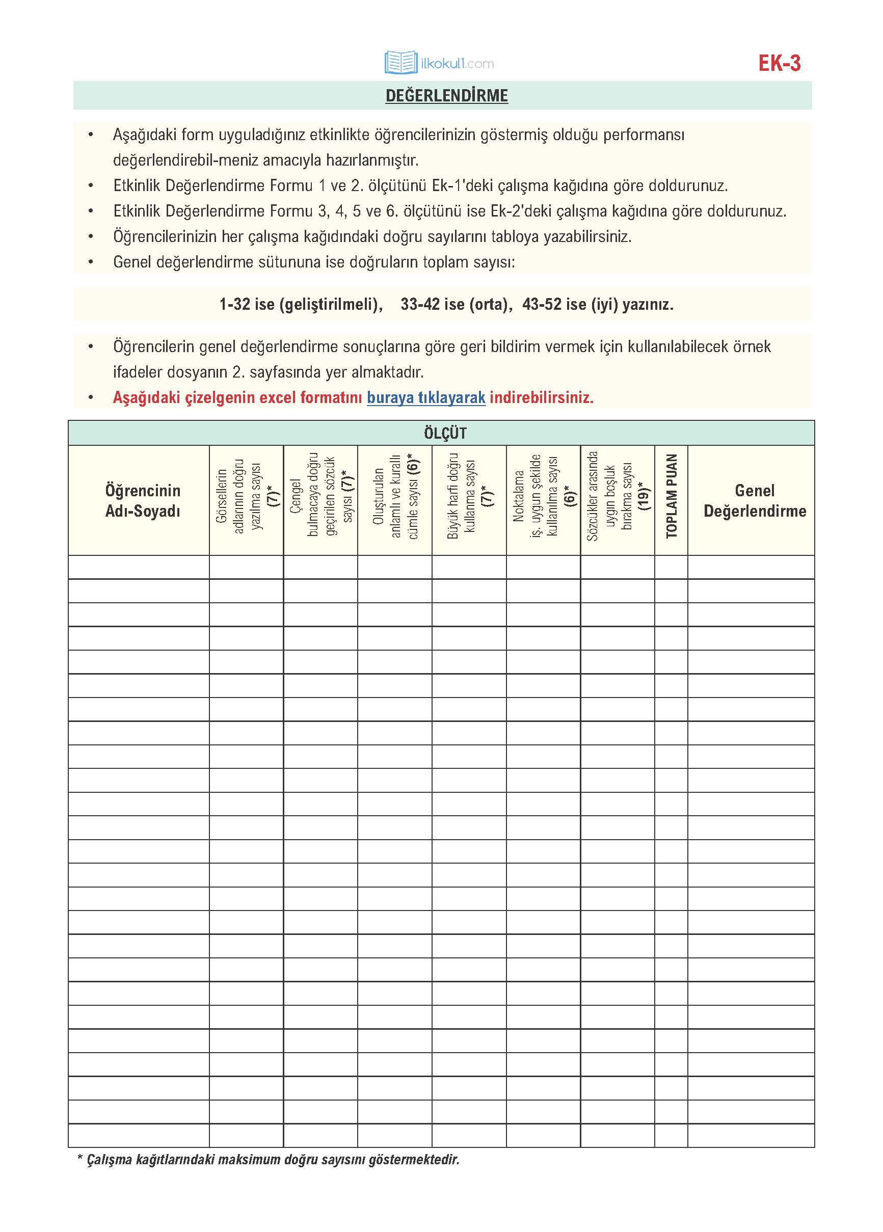 Bu özgün çalışmanın değerlendirme formu kısmını öğretmenlerimizin daha kolay kullanabilmesi için excel formatında da geliştirdik.