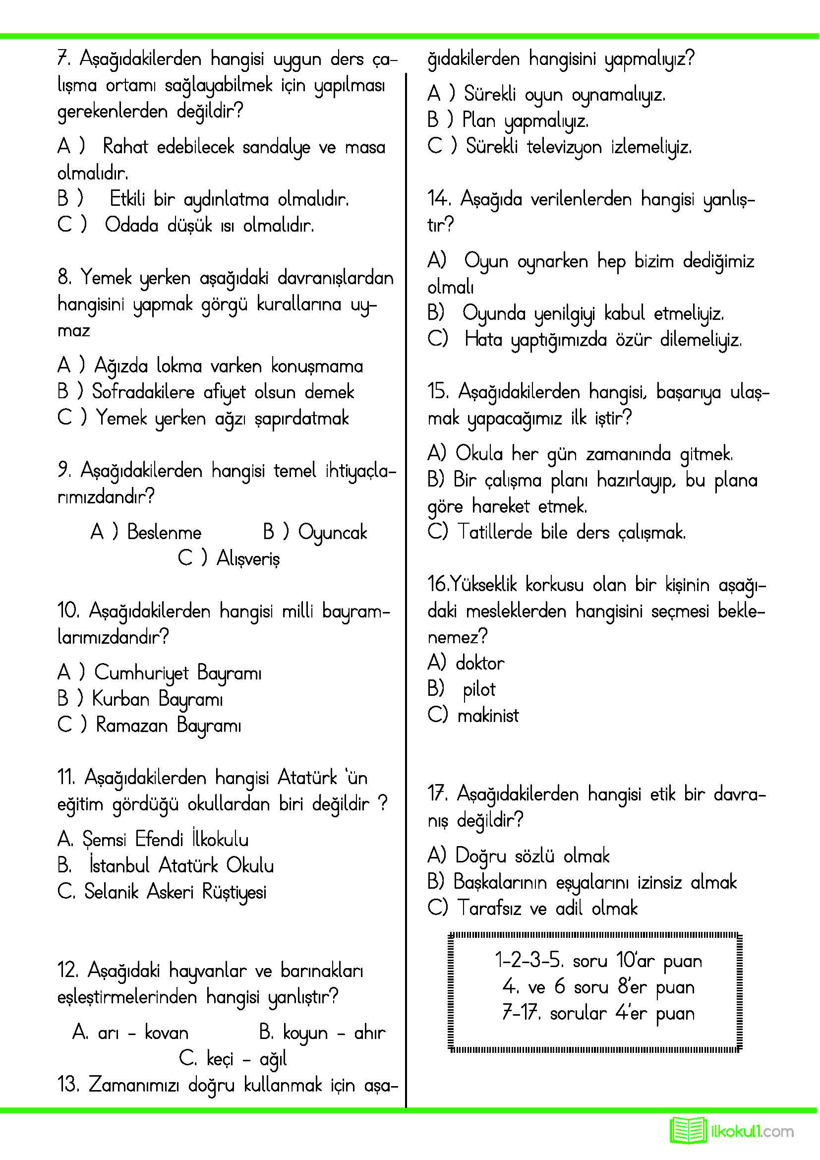 2. Sınıf Hayat Bilgisi Genel Değerlendirme Sın...