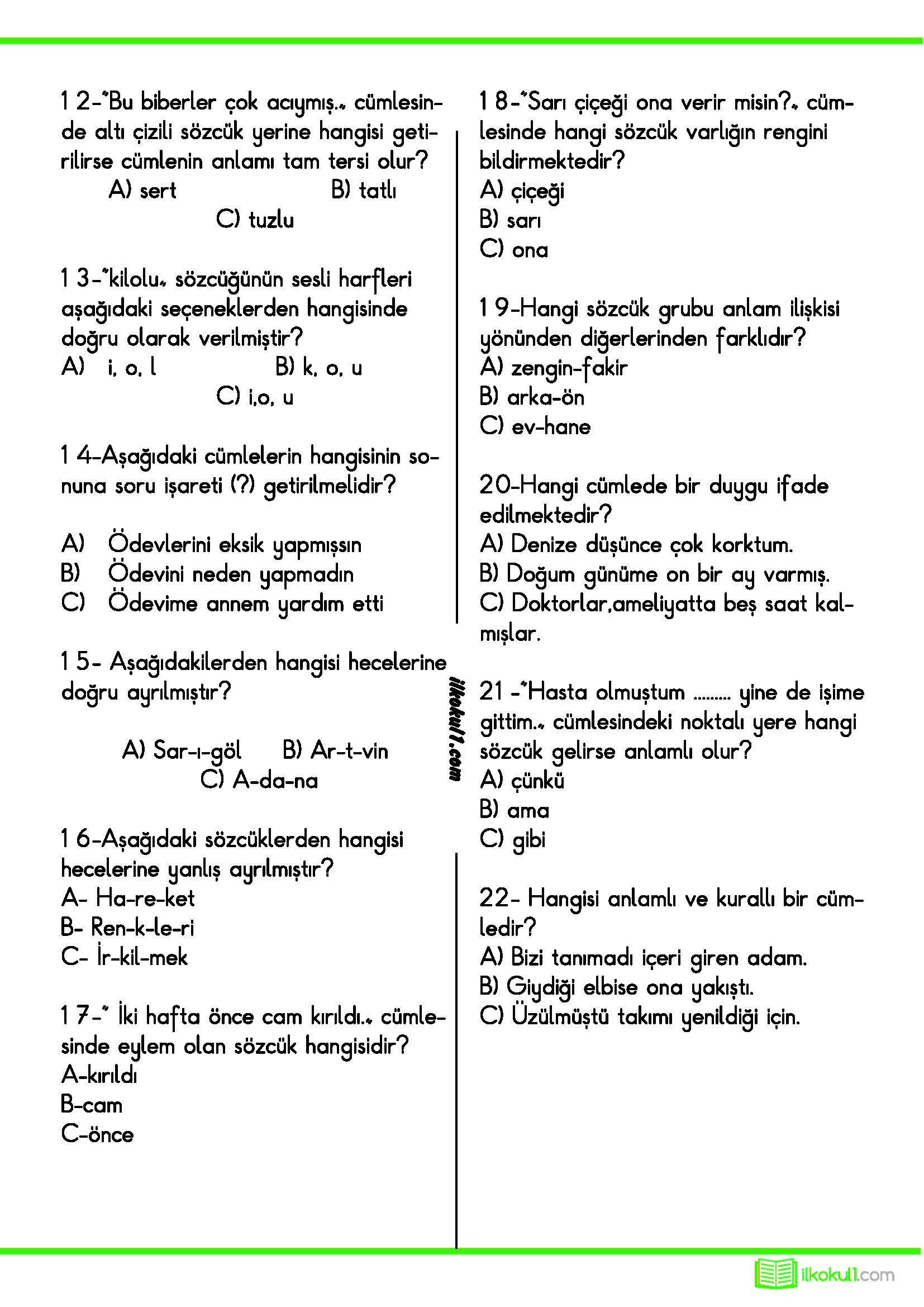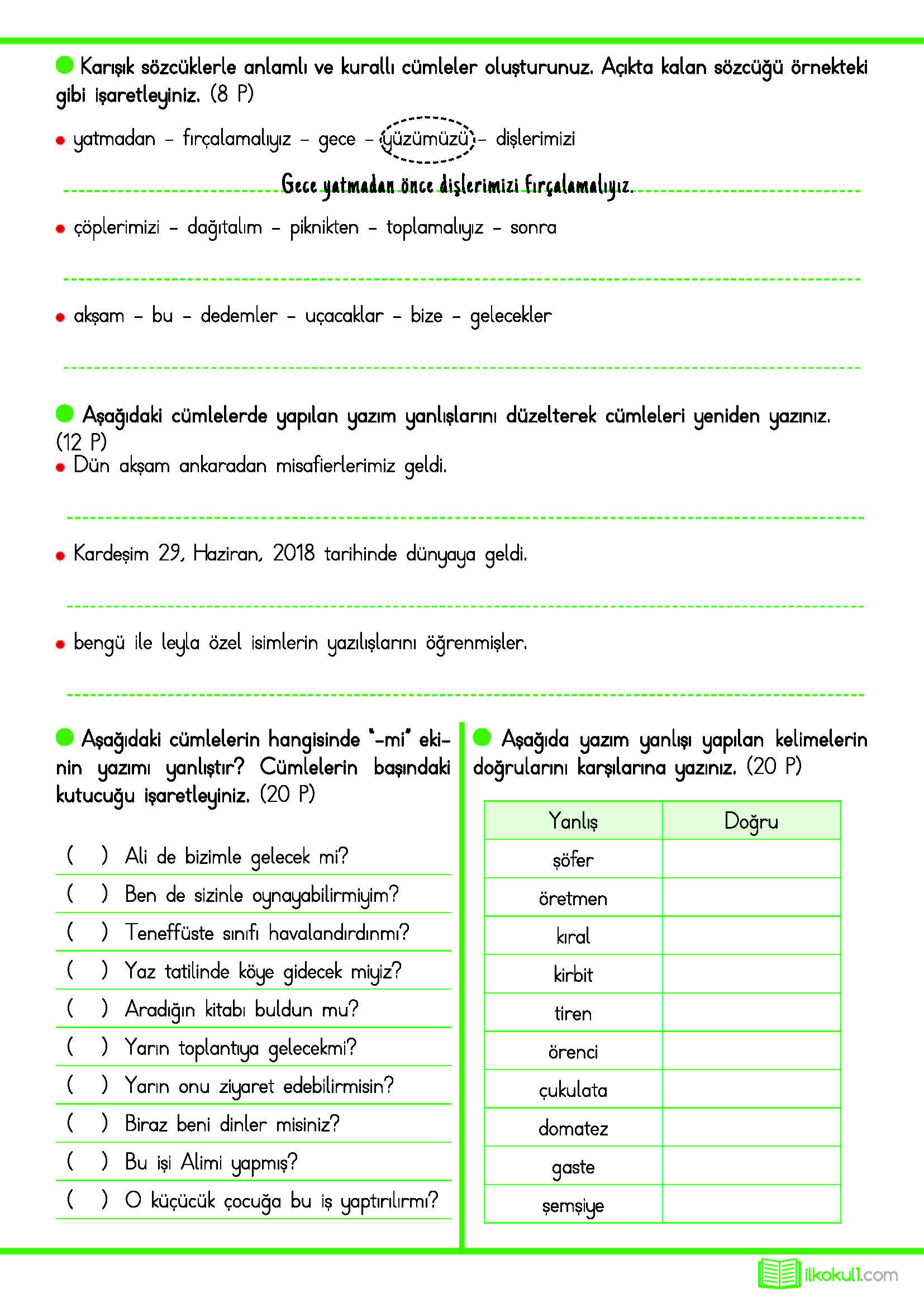 2. Sınıf Türkçe Değerlendirme Etkinliği