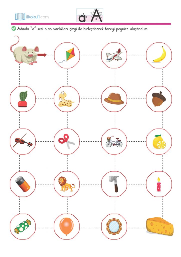 7. Adında “a” sesi olan varlıkları çizgi ile birleştirerek fareyi peynire ulaştıralım.