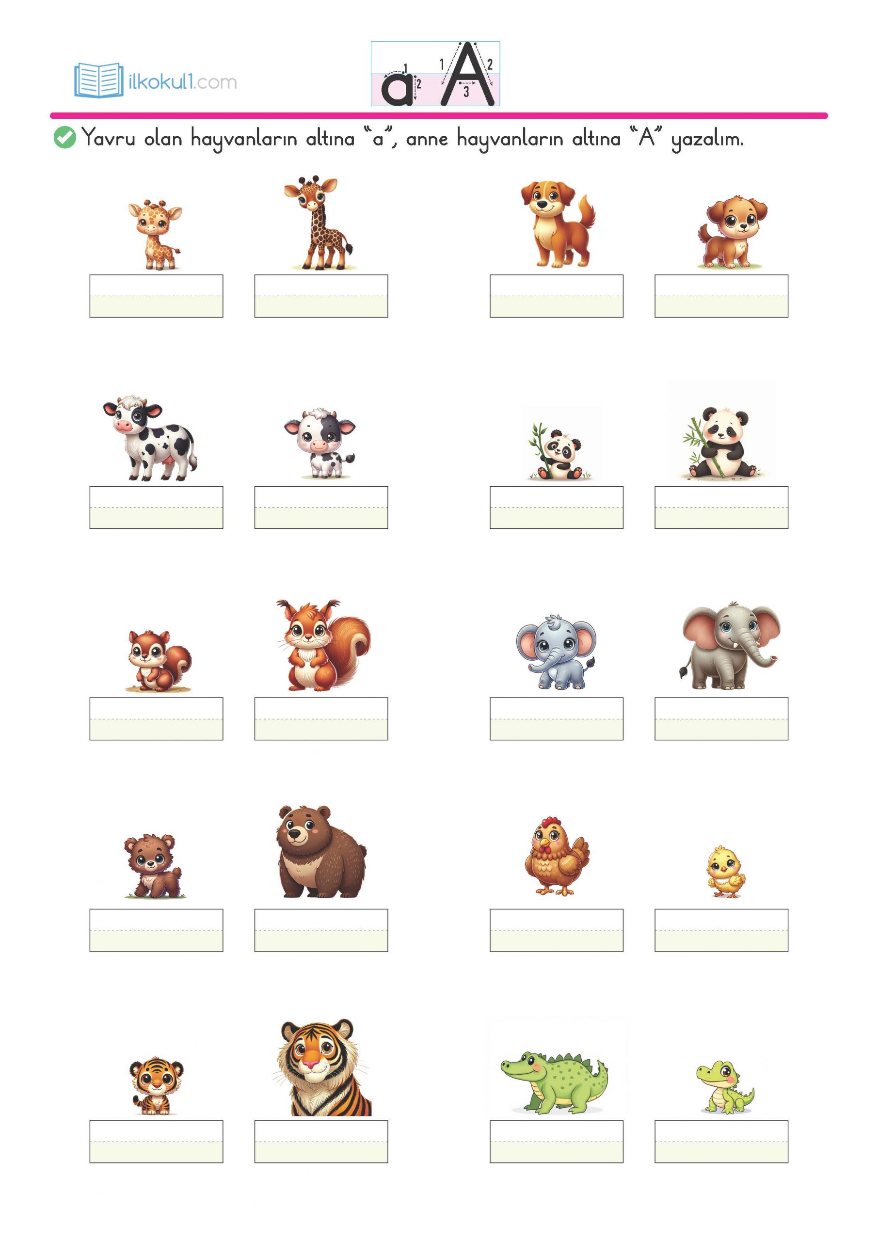 18. Yavru olan hayvanların altına “a”, anne hayvanların altına “A” yazalım.