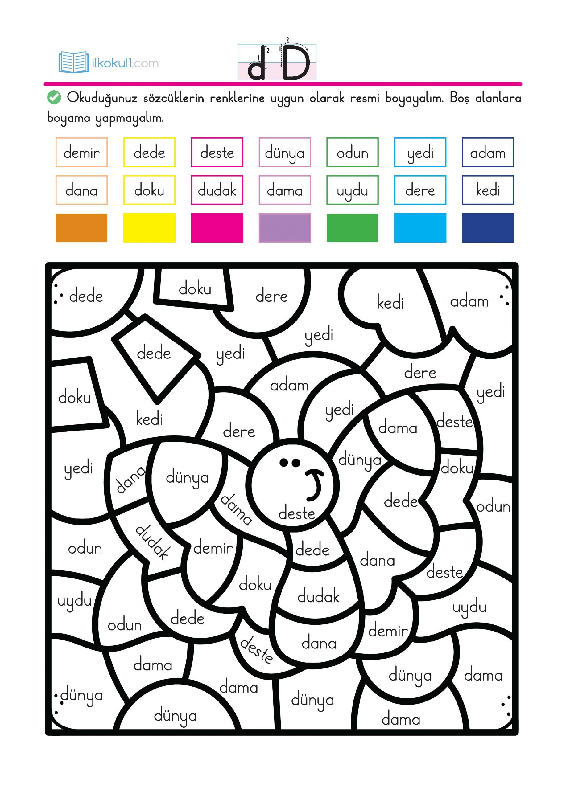 - Okuduğumuz kelimelerin renklerine uygun olarak resmi boyayalım.