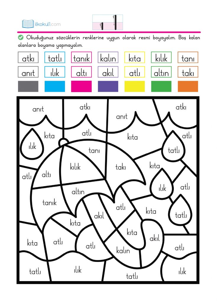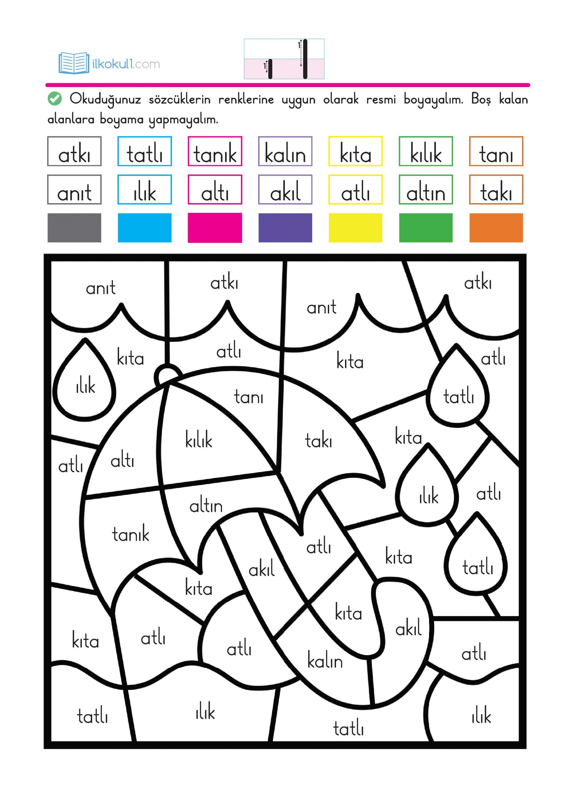 - Okuduğumuz kelimelerin renklerine uygun olarak resmi boyayalım.