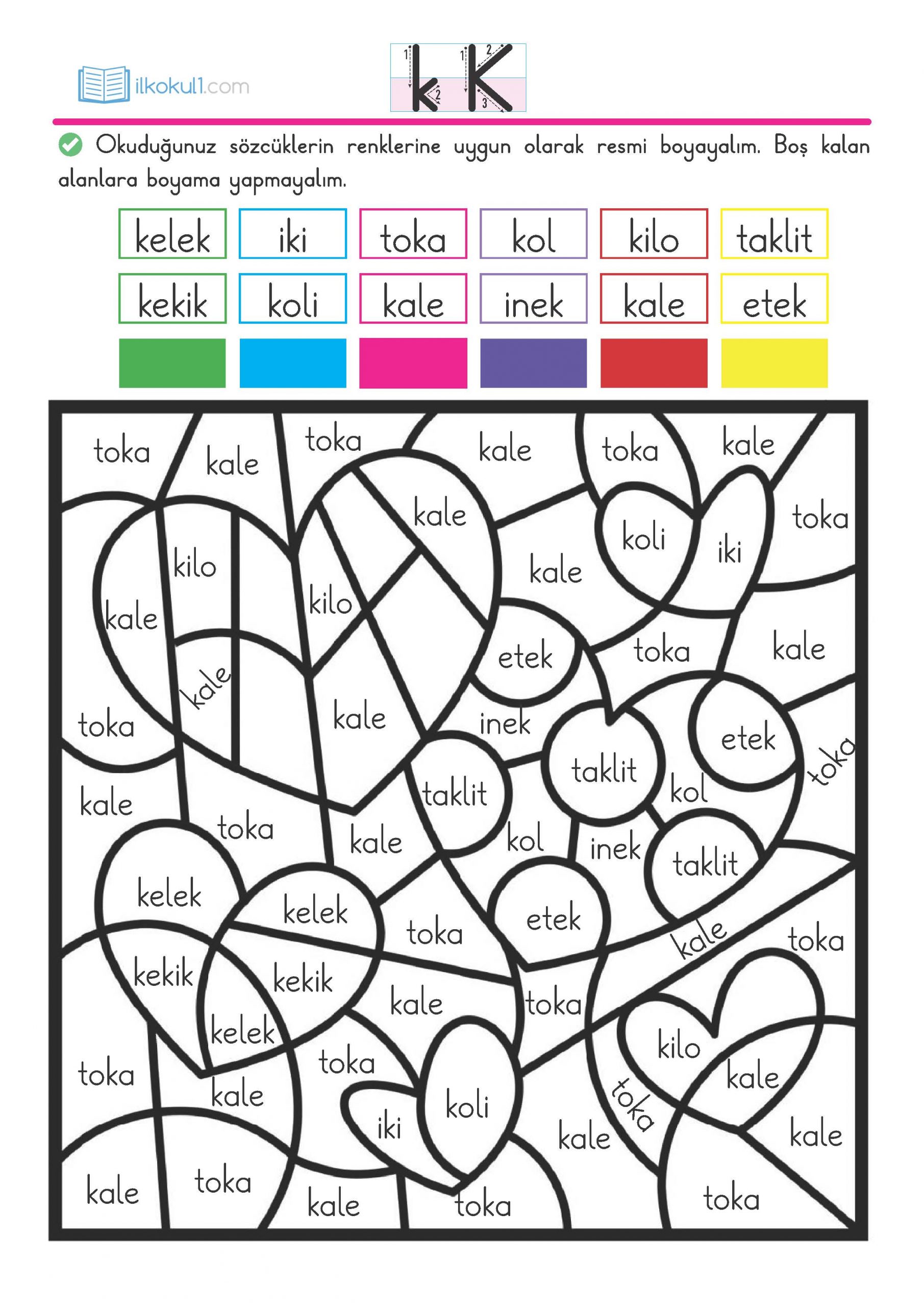 - Aşağıdaki görsellerin adında bulunan “k” sesi kadar kalp boyayalım.
