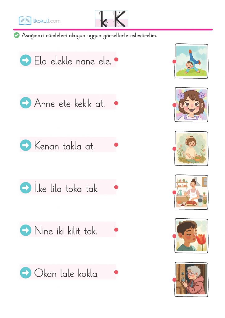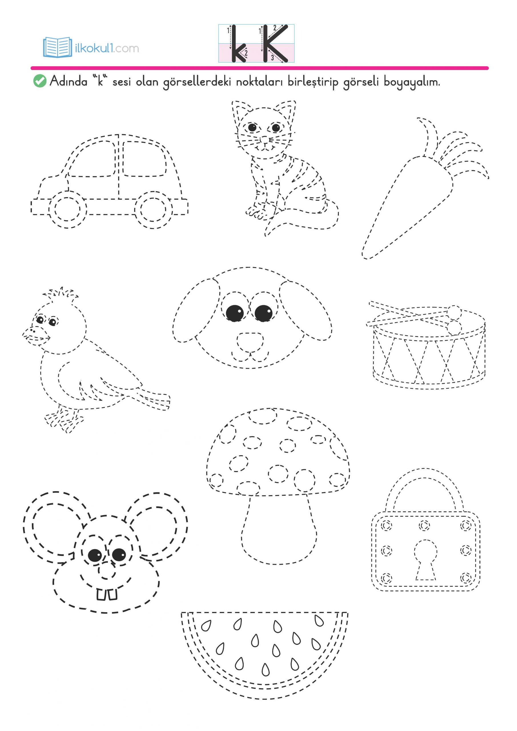- Adında “k” sesi olan görsellerdeki noktaları birleştirip görseli boyayalım.