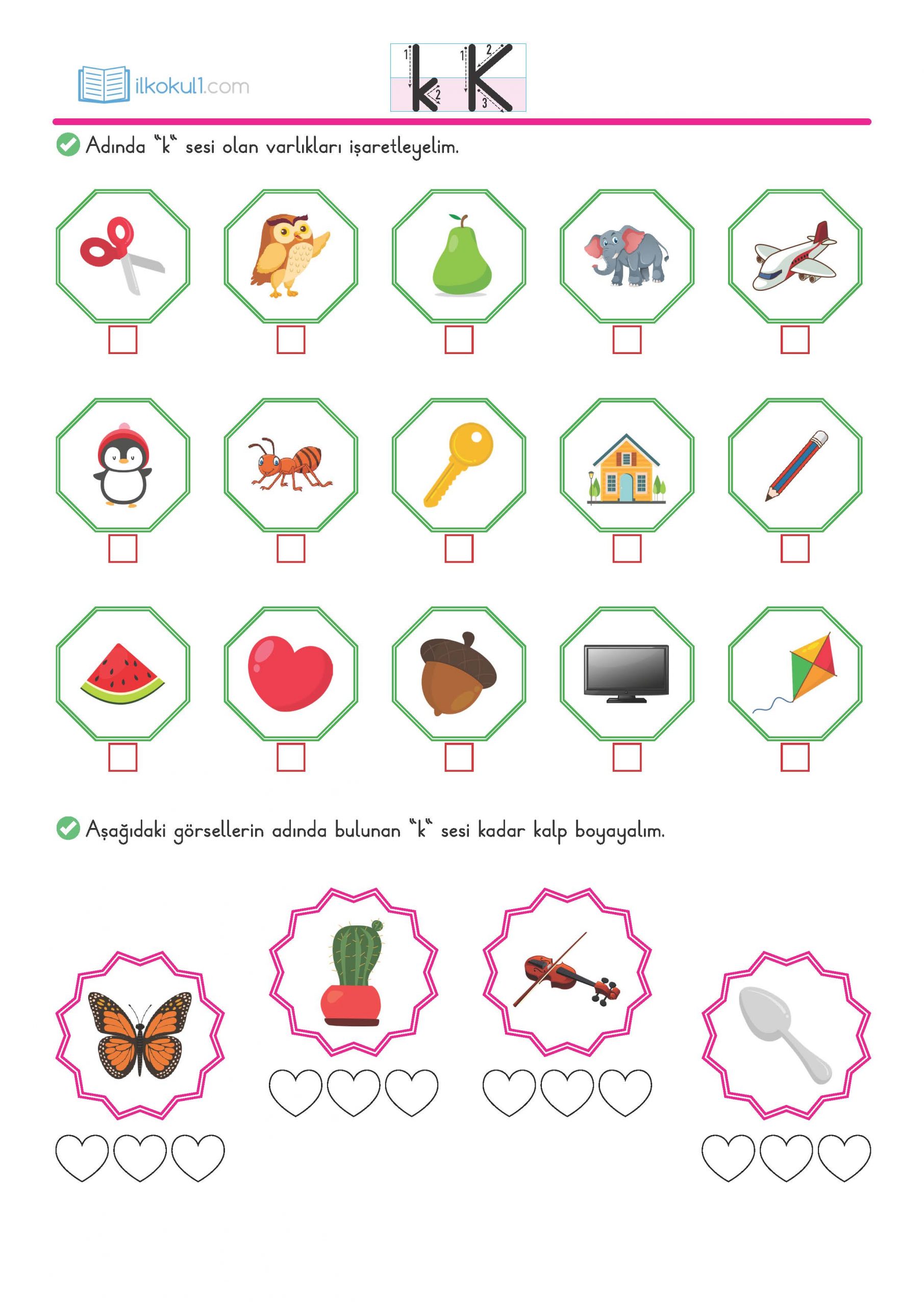 - Aşağıdaki görsellerin adında bulunan “k” sesi kadar kalp boyayalım.