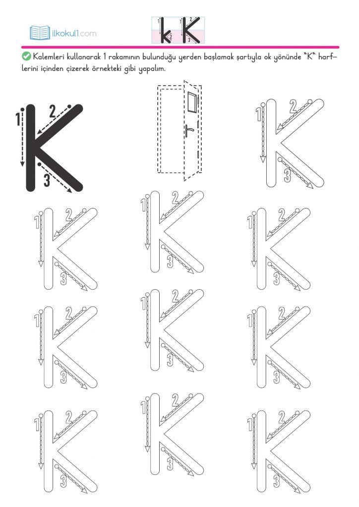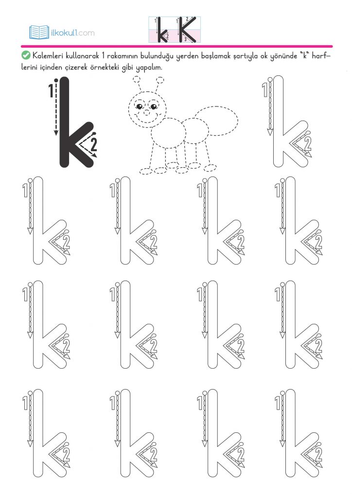 - Kalemleri kullanarak 1 rakamının bulunduğu yerden başlamak şartıyla ok yönünde “k” harflerini içinden çizerek yapalım.