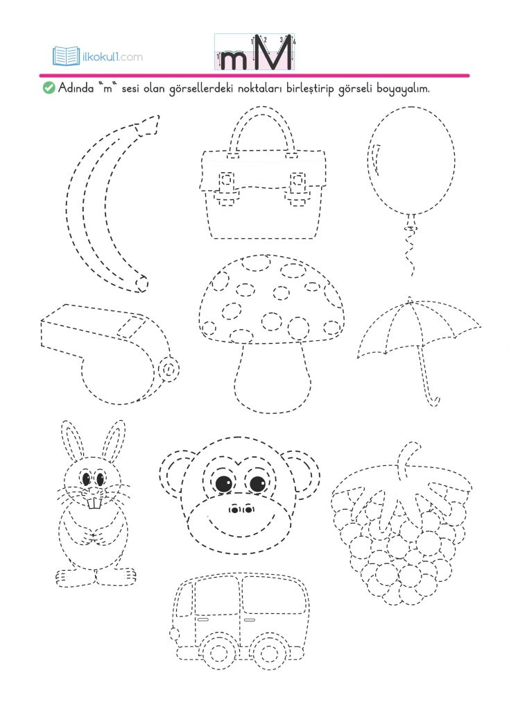 - Adında “m” sesi olan görsellerdeki noktaları birleştirip görseli boyayalım.