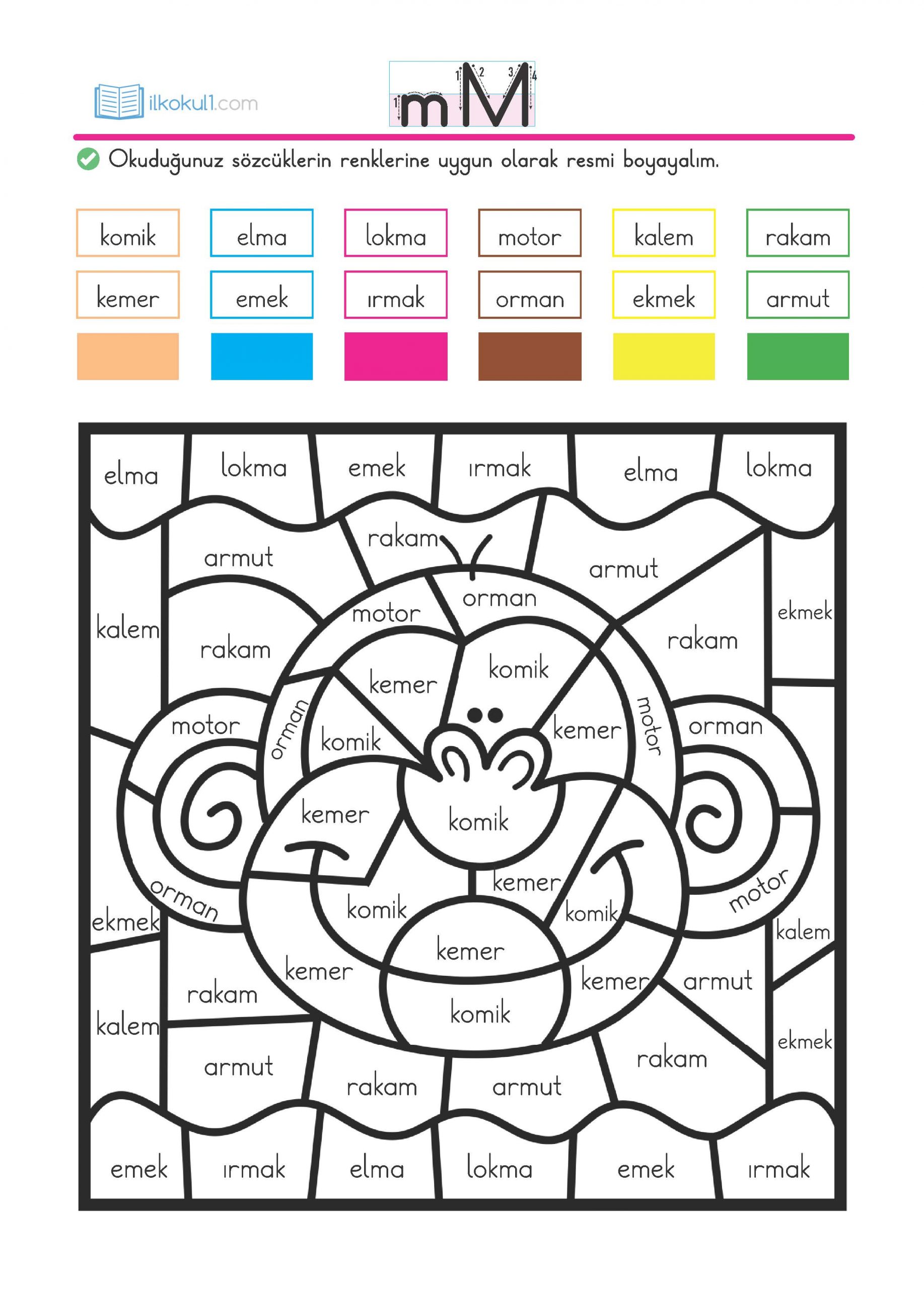 - Okuduğumuz kelimelerin renklerine uygun olarak resmi boyayalım.