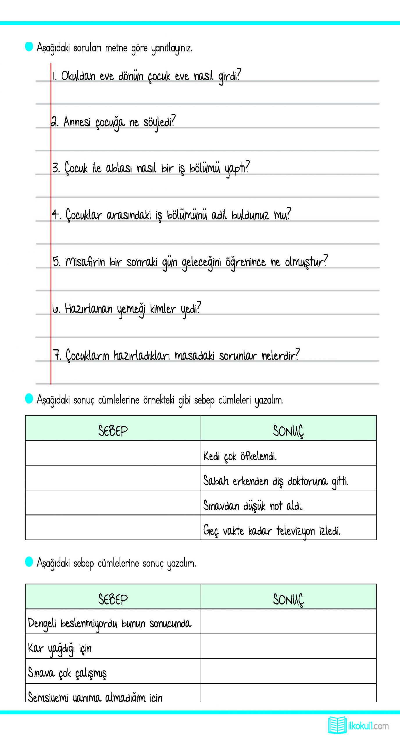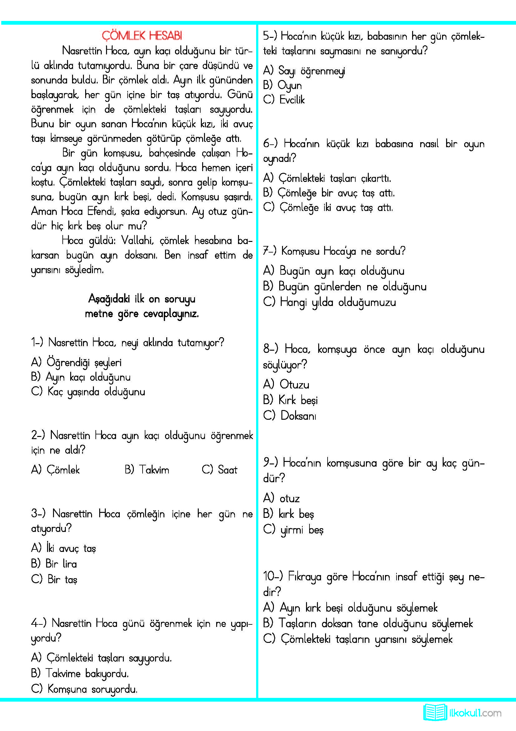 3. Sınıf Türkçe Okuma Anlama Etkinliği