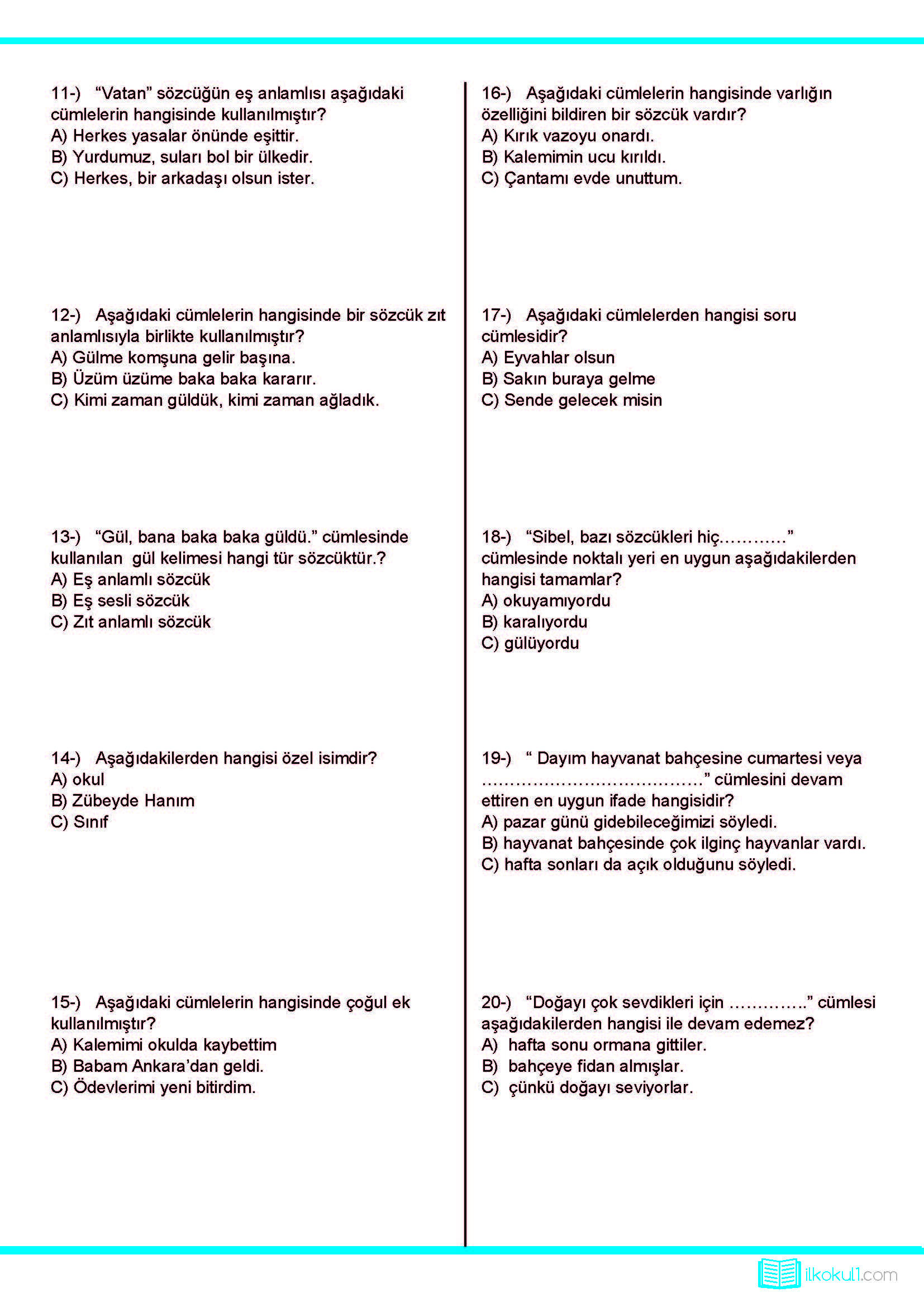 3. Sınıf Türkçe Genel Değerlendirme Testi