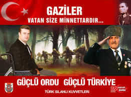 Bu gün 19 Eylül GAZİLER Günü Bilindiği gibi, Muharip Gazi, harbe katılıp da, harpten sağ olarak dönen savaşmış kahramanlardır. Gazilik unvanı devlet tarafından verilir. En büyük Gazi, bu unvanı 19 Eylül 1921 tarihinde Türkiye Büyük Millet Meclisi’nin kararı ile alan vatanın kurtarıcısı ve kurucusu Gazi Mustafa Kemal Atatürk’tür. 2002 senesinde çıkartılan yasa ile 19 Eylül günü Gaziler günü olarak kabul edilmiştir. Tarih boyunca hür ve bağımsız yaşamış Türk milleti işgal ve esarete alışık olmayan asil ve büyük bir millettir. Bu nedenle tarihinde bu uğurda çok savaş yapmış birçok insanını şehit ve gazi vermiştir.