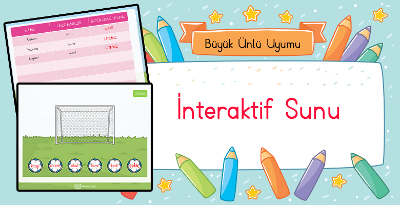 3. Sınıf düzeyinde büyük ünlü uyumu konusunda kullanılabilinecek interaktif bir sunu hazırladık. Öğrencilerimizin keyifle yapmaları için futbol teması kullandık. Bu sunu ile büyük ünlü uyumu zevkle işleyebileceksiniz.