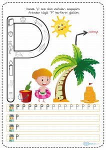 Tamamı özgün 36 etkinlik sayfası bulunmaktadır. Dik temel harfler etkinlikleri “p” sesi çalışmaları ise şu şekilde;
