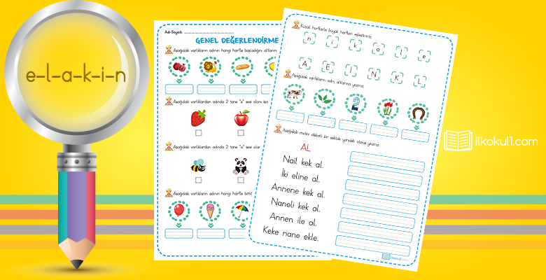 Dik temel harfler 1.ses grubu “e, l, a, k, i, n” seslerini içeren değerlendirme etkinliği. Özgün çalışmamız öğrencilerin durumlarını görmek için hazırlanmıştır.