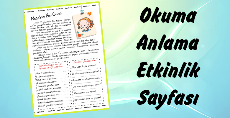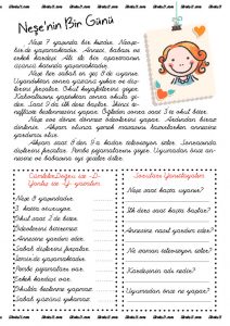 Neşe’nin bir günü başlıklı özgün okuma anlama metni. Metin ile ilgili sorular ve doğru yanlış çalışması. Okuma anlama etkinlik sayfasını aşağıdaki küçük resme tıklayarak bilgisayarınıza indirebilirsiniz.