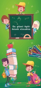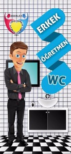 Bu yıl okulumda sene başında 1. sınıflar 10 şube olarak planlanmıştı. Şubelerinde ortalama 35 er kişi olduğunu düşünürsek uyum haftası bile yapılmadan okula başlayan 350 yeni çocuk demekti bu. Bu çocukların okuldaki diğer öğrencilerle birlikte aynı anda okula başlamaları ders giriş çıkışlarında kaybolan ve sınıfını bulamayan öğrenciler olarak bir sorun olacaktı. Okulun çok katlı ve karmaşık olduğunu da eklemem gerek. Bu kaybolmaları engellemek için sene başında her sınıfa bir figür belirledik ve az bir maliyetle sınıf kapılarına poster hazırlayıp yapıştırdık. 35×50 boyutunda olan bu posterleri sınıf kapılarına yapıştırdıktan sonra aynı figür ile öğrencilere yaka kartı hazırladık. Kızlar için ayrı erkekler için ayrı kartlar tasarladık. Aşağıda örnek bir sınıf kapımızı ve öğrenci kartını görebilirsiniz.