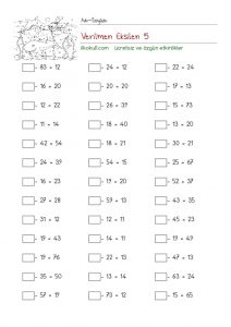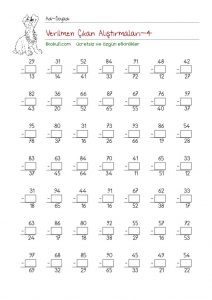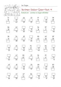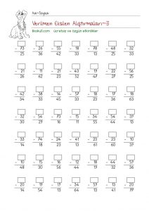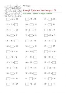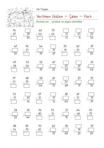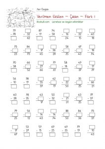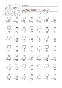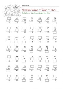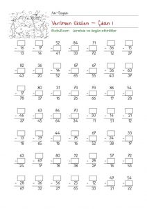 Eksileni, çıkanı veya farkı verilmeyen 2 basamaklı çıkarma işlemi alıştırma sayfaları. 19 farklı işlem sayfası. Çalışmaları aşağıdaki küçük resimlere tıklayarak indirebilirsiniz.