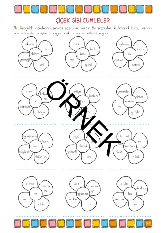 Aşağıdaki çiçeklerin üzerinde sözcükler vardır. Bu sözcükleri kullanarak kurallı ve an-