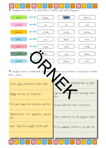 Aşağıdaki sözcüklerin eş anlamlılarını örnekteki gibi bulup boyayınız.