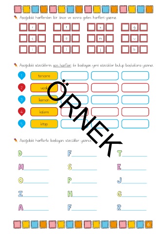 Aşağıdaki harflerden bir önce ve sonra gelen harfleri yazınız.
