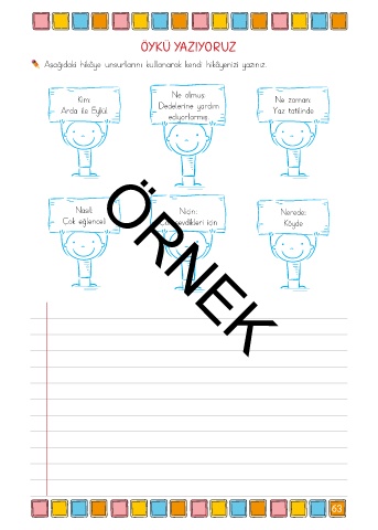ÖYKÜ YAZIYORUZ Aşağıdaki hikâye unsurlarını kullanarak kendi hikâyenizi yazınız. Ne olmuş: Kim: Ne zaman: Arda ile Eylül Dedelerine yardım Yaz tatilinde ediyorlarmış. Nasıl: Niçin: Nerede: Çok eğlenceli Çok sevdikleri için Köyde ÖRNEK 63