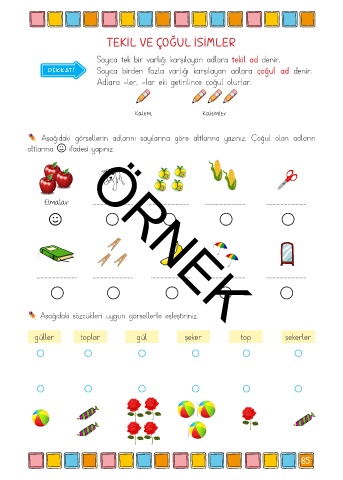 Aşağıdaki görsellerin adlarını sayılarına göre altlarına yazınız. Çoğul olan adların