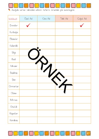 Aşağıda verilen tablodaki adların türlerini örnekteki gibi işaretleyiniz. Özel Ad Cins Ad Tekil Ad Çoğul Ad SÖZCÜKLER Emreler Kurbağa Elbiseler Kalemlik Silgi Kedi Minder ÖRNEK Beşiktaş Şişe Ormanlar Elbise Minnoş Gözlük Köpekler Karabaş 87