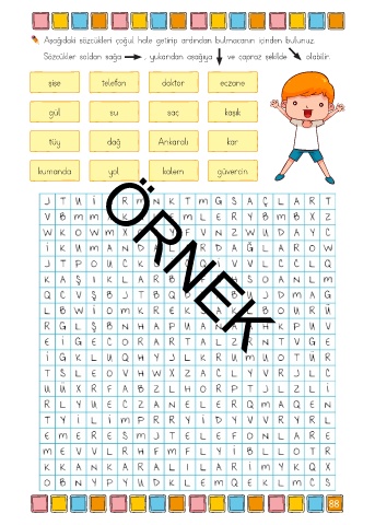 Aşağıdaki sözcükleri çoğul hale getirip ardından bulmacanın içinden bulunuz. Sözcükler soldan sağa , yukarıdan aşağıya ve çapraz şekilde olabilir. şişe telefon doktor eczane gül su saç kaşık tüy dağ Ankaralı kar kalem güvercin kumanda ÖRNEK yol 88