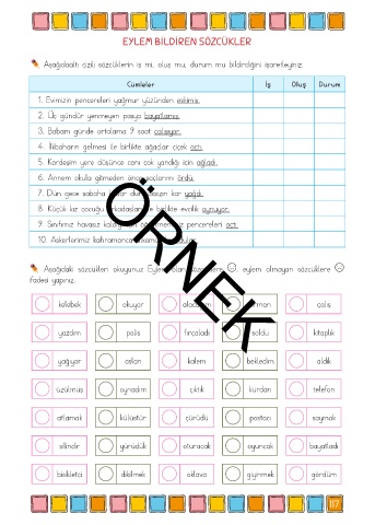 Aşağıdaki sözcükleri okuyunuz Eylem olan sözcüklere , eylem olmayan sözcüklere