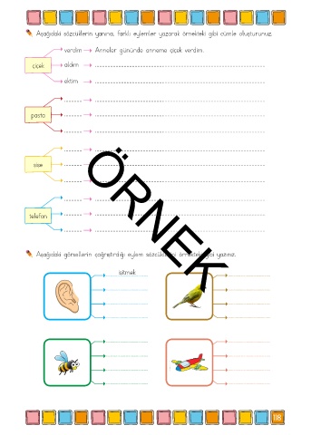 Aşağıdaki sözcüklerin yanına, farklı eylemler yazarak örnekteki gibi cümle oluşturunuz.