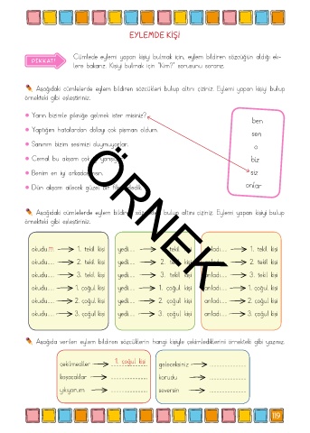 Aşağıda verilen eylem bildiren sözcüklerin hangi kişiyle çekimlediklerini örnekteki gibi yazınız.