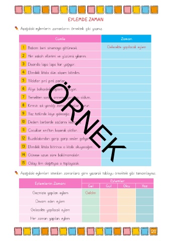 Aşağıdaki eylemleri istenilen zamanlara göre yazarak tabloyu örnekteki gibi tamamlayınız.