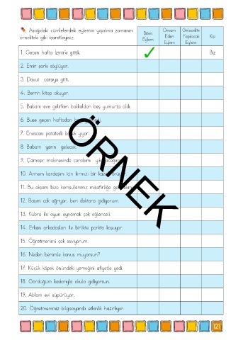 Aşağıdaki cümlelerdeki eylemin yapılma zamanını Biten Devam Gelecekte