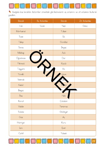 Aşağıda boş bırakılan bölümleri örnekteki gibi kelimelerin eş anlamını ve zıt anlamını bularak