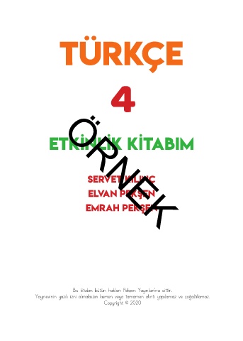 TÜRKÇE 4 ETKİNLİK KİTABIM SERVET KILINÇ ELVAN PEKŞEN EMRAH PEKŞEN ÖRNEK Bu kitabın bütün hakları Pekşen Yayınları’na aittir. Yayınevinin yazılı izni olmaksızın kısmen veya tamamen alıntı yapılamaz ve çoğaltılamaz. Copyright © 2020